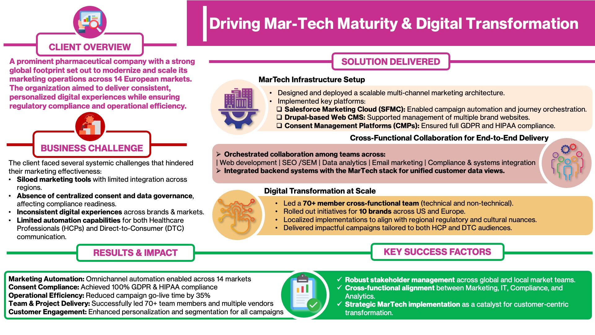 Global pharma leader modernized marketing across 14 markets using Salesforce Marketing Cloud, Drupal CMS, and compliance tools, achieving 35% faster campaigns and omnichannel automation.